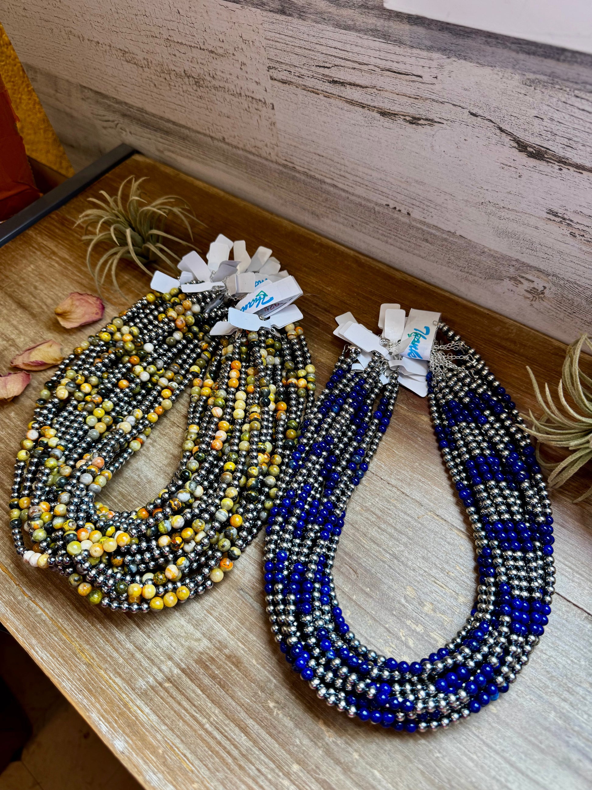 This 18-inch necklace is handmade by us in North Texas, featuring 5mm sterling silver pearls paired with bold 6mm bumblebee jasper beads in rich shades of yellow, gold, and grey.