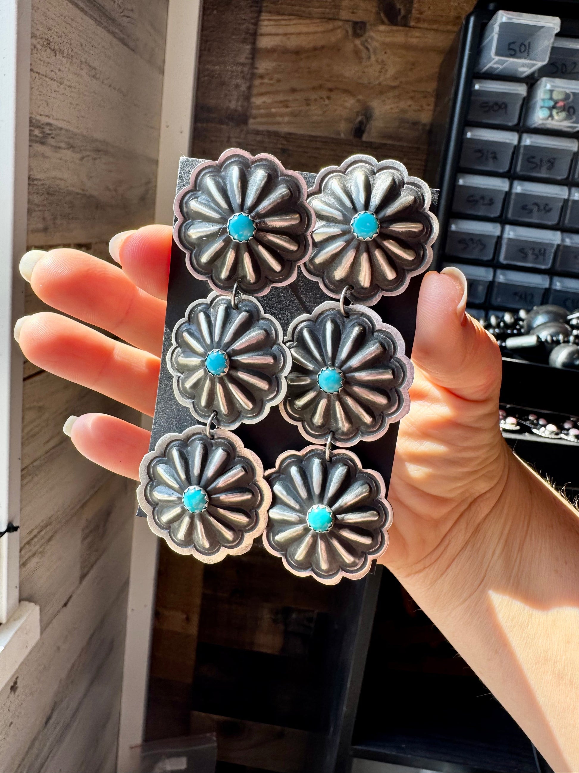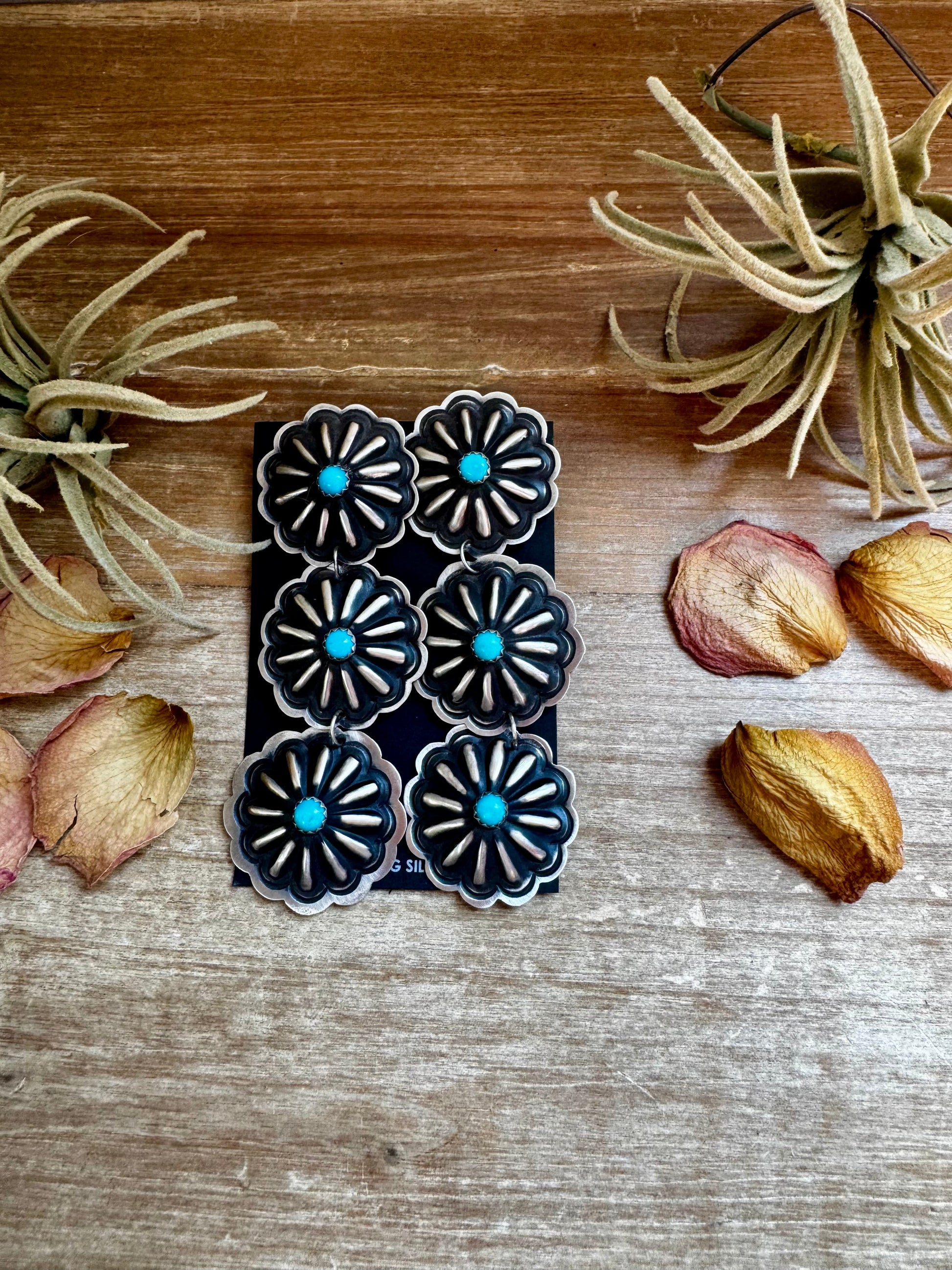 Triple Concho Dangle Earrings with Kingman Turquoise – Sterling Silver, Post Top