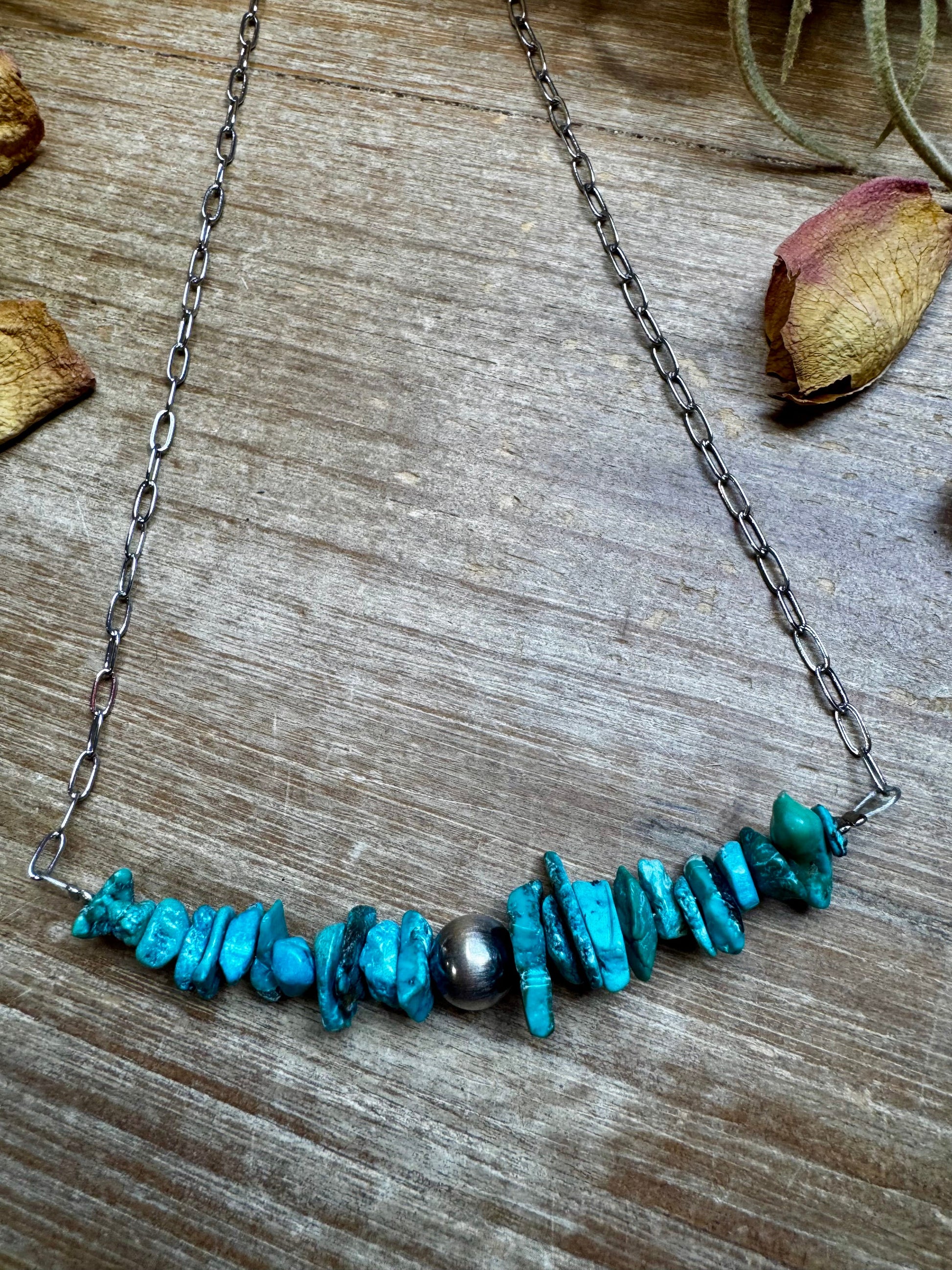 Each turquoise chip is one of a kind—shaped by nature and full of unique color variations and character. A simple piece with a bold, organic vibe.